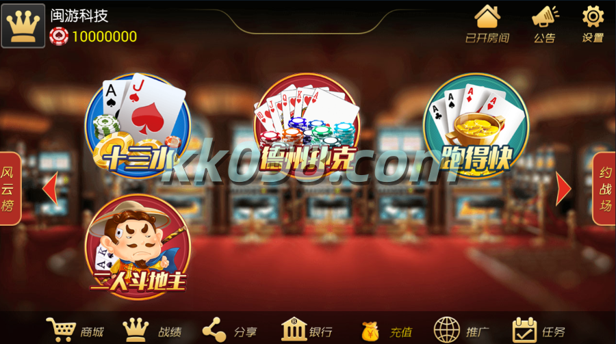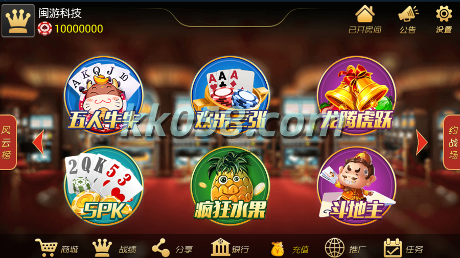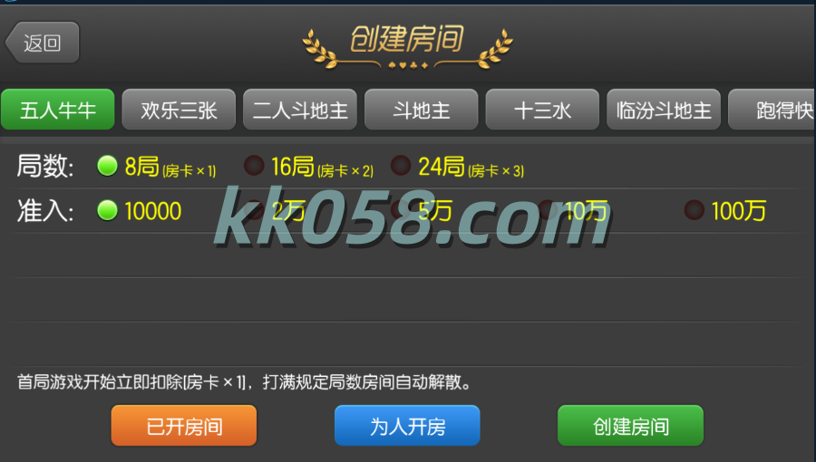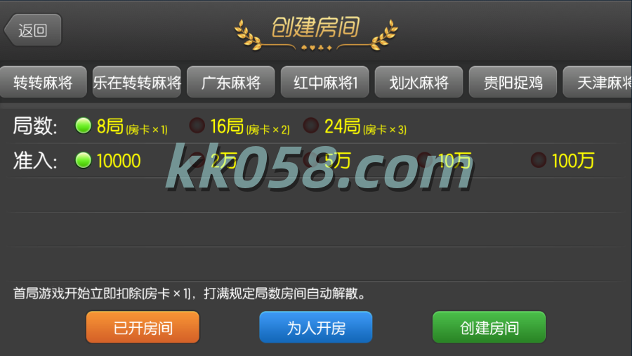 房卡游戏含:五人牛牛,欢乐三张,二人斗地主,斗地主,十三水,临汾斗地主,跑得快,转转麻将,乐在转转麻将,广东麻将,红中麻将,划水、贵阳捉鸡、划水麻将、天津麻将,四川麻将等 更多棋牌电玩